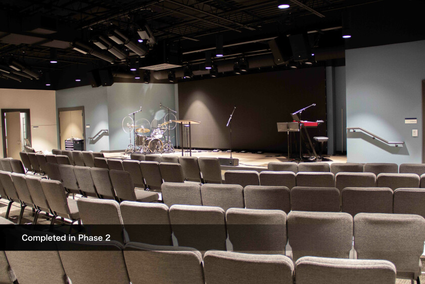 The South Campus Chapel renovation has been completed. The renovations on the Chapel include new paint, lighting, audio/video, and stage flooring. These upgrades will make this space even more beautiful and functional for worship, weddings, and funerals. Thank you for your generosity and support of this wonderful project!